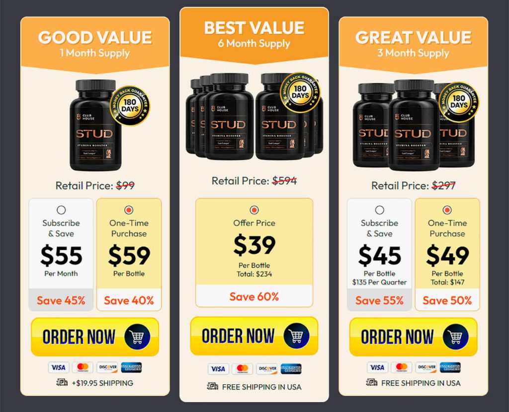 Clubhouse Stud is priced at $59 for a single bottle. For bulk purchases, the pricing is more economical: 3 bottles for $147 and 6 bottles for $234, offering significant savings.